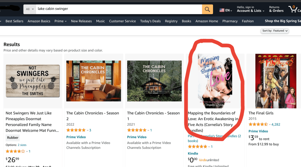 Here’s an example: If I do a general search for “lake cabin swinger” (one of the topics I return to again and again … what can I say, I like cabins! And swingers!), one of my books, an omnibus collection of “Mapping the Boundaries of Love,” will show up: